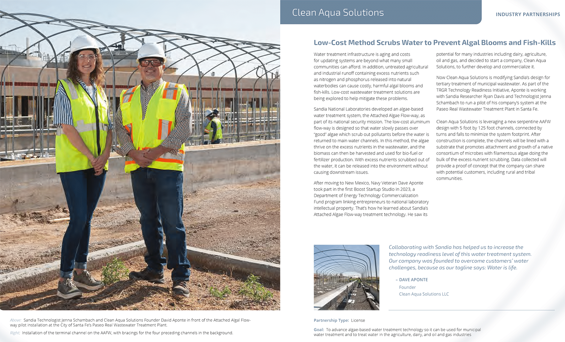 Clean Aqua Solutions is working with Sandia National Laboratories to develop low-cost water treatment solutions that help reduce algal blooms and improve water quality. This effort supports more sustainable solutions across multiple industries.